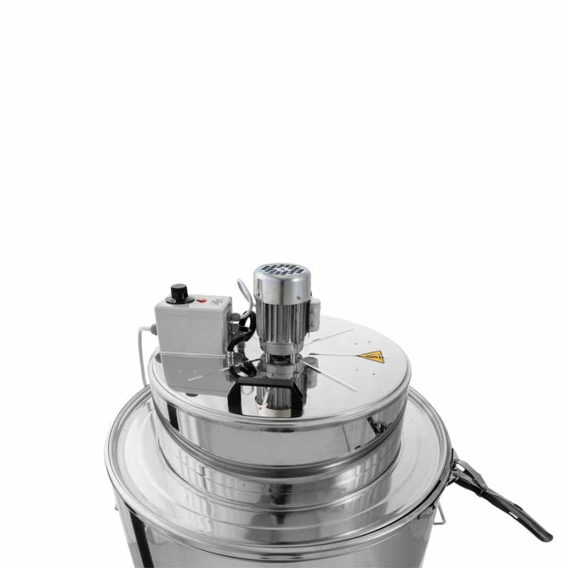 The heating element is located in the insulated lid of the unit. The temperature can be set between 30°–90°C using a thermostat. A circulation fan ensures an even temperature throughout the container. The cappings wax begins to melt, the honey flows to the bottom of the vessel, and the melted wax covers the honey, protecting it from overheating.