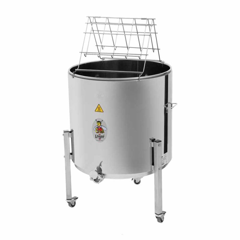 Suitable for: whole combs (no cutting) – ideal for melting cappings wax, melezitose and crystallized honey. Capacity: approx. 40 kg of cappings wax; space for approx. 14 Zander / 14 DNM / 28 Dadant sheets / approx. 12 Langstroth (1/1) or 18 AZ frames. Maximum internal dimensions: internal kettle diameter 63 cm, internal height 51 cm.