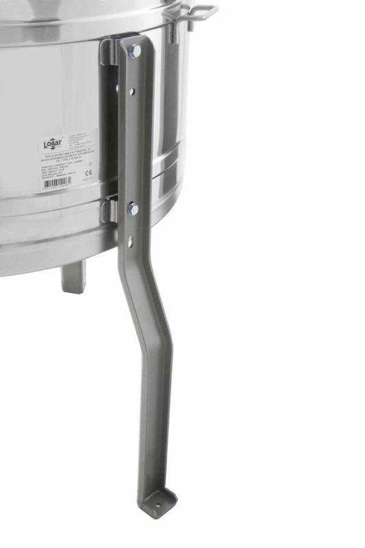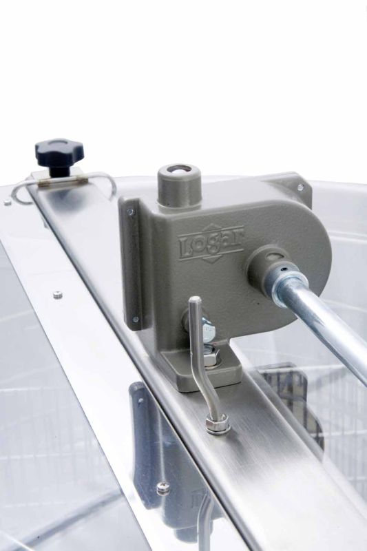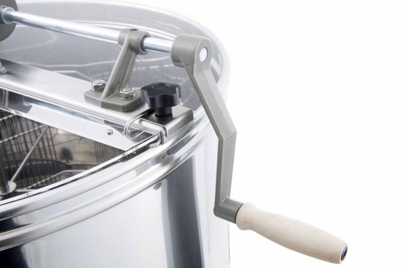 12/8-frame radial honey extractor, hand-cranked in a metal housing with freewheel and back-pressure brake. State-of-the-art design has allowed an innovative construction of the extractor bottom. The drum bottom is seam-welded and sloped toward the outlet. The stainless steel pinch tap is welded at the lowest possible point so all honey can drain from the extractor. All parts that come into contact with honey are made from food-grade materials. The lid is transparent acrylic. A special design of the feet ensures stable support for the extractor.