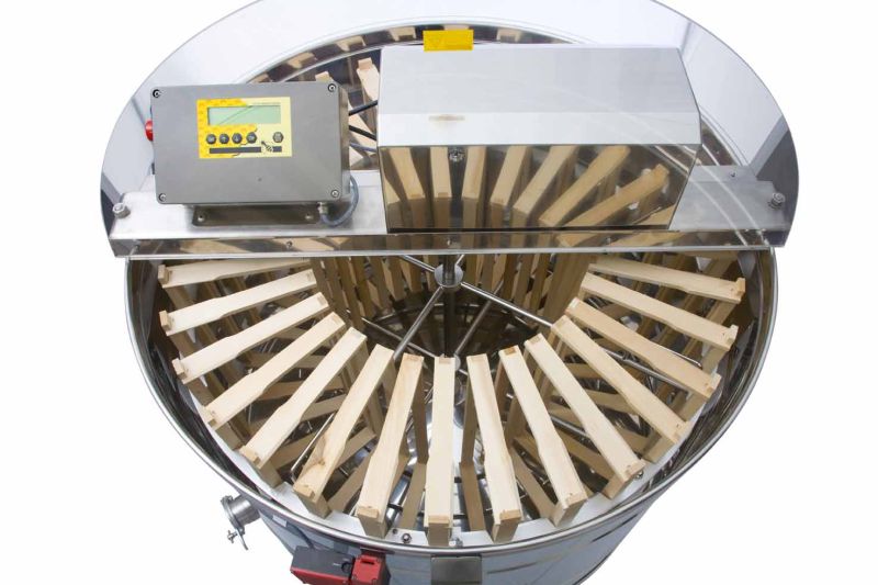56-frame radial honey extractor by Logar (Item No. 4575), with motor drive 750 W / 230 V and fully automatic control. The machine is equipped with a built-in safety lock that prevents the lid from being opened during operation. The extractor has two stainless steel squeeze valves (Ø 2''). The lower valve is fitted at the lowest possible point so that all honey can drain from the extractor. All parts that come into contact with honey are made from food-grade materials. The lid is made of transparent acrylic so you can monitor the extraction process at any time.