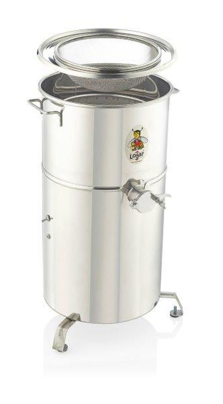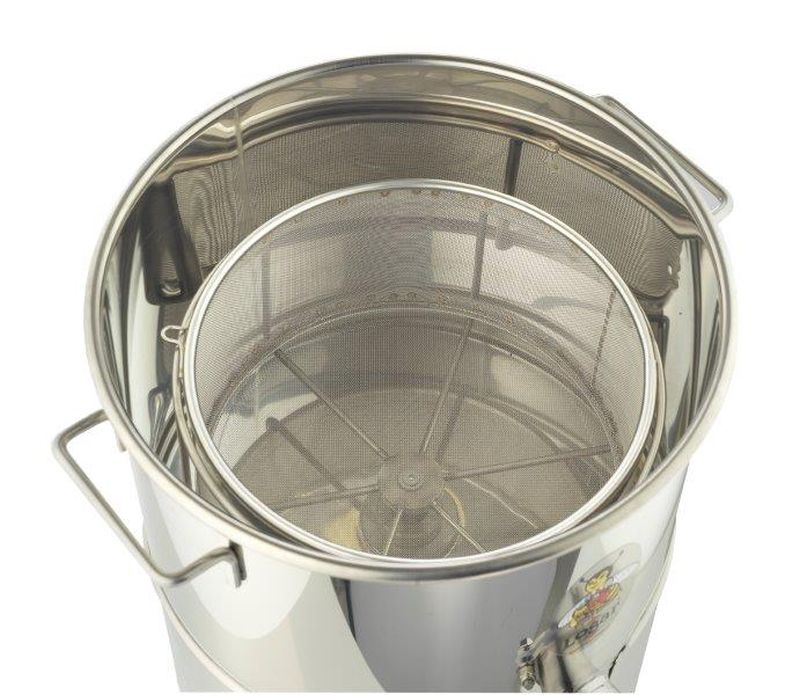 The container is made of stainless steel, has two handles for easy handling and is fitted with a pinch tap. A rotating mechanism with a holder for the removable fine filter basket is installed inside the container. A round coarse sieve with a diameter of 25 cm is placed into the retaining ring on top of the container.