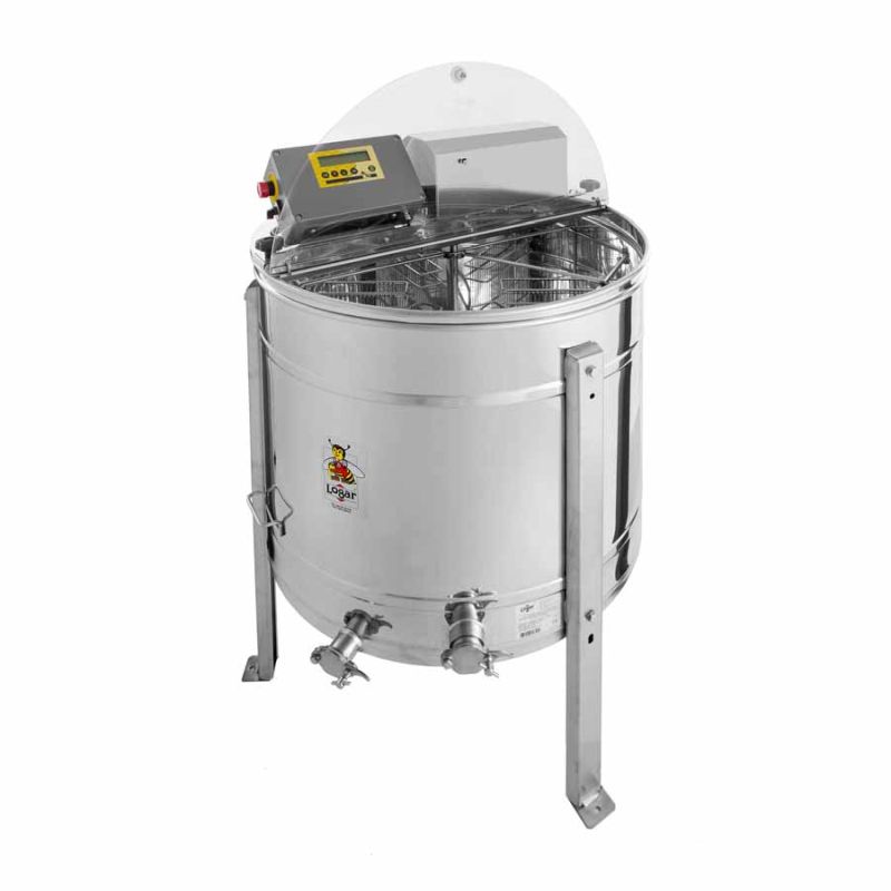 4-frame self-reversing honey extractor with motor drive 180 W / 230 V and fully automatic control. The extractor is equipped with an integrated safety switch that automatically stops the motor when the lid is opened. State-of-the-art engineering provides a seamlessly welded tank bottom sloped toward the outlet; the stainless honey outlet is positioned at the lowest possible point so that all honey can drain away. All parts that come into contact with honey are made from food-grade materials. The lid is made of transparent acrylic glass.