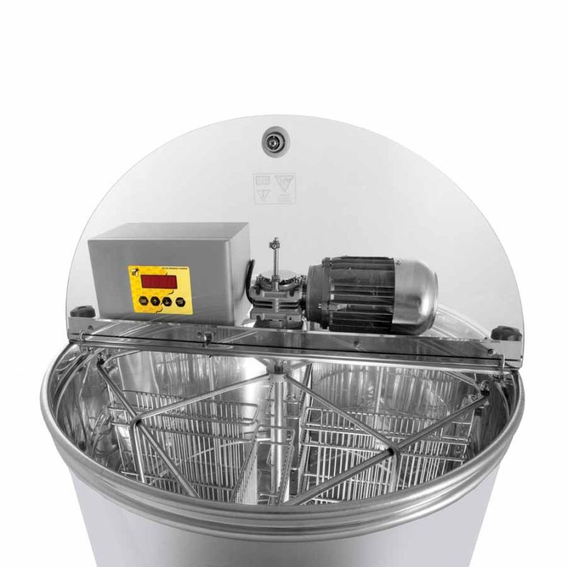 4-frame self-reversing honey extractor with 110 W / 230 V motor drive, fully automatic control and safety switch that automatically stops the motor when the lid is opened. State-of-the-art engineering allowed us to design an improved extractor bottom. The bottom of the vat is welded seamless and sloped toward the outlet. The stainless-steel honey gate is welded at the lowest possible point so that all honey can flow out of the extractor. All parts that come into contact with honey are made from food-safe materials. The lid is made of transparent acrylic. A special construction of the feet provides stable support for the extractor.