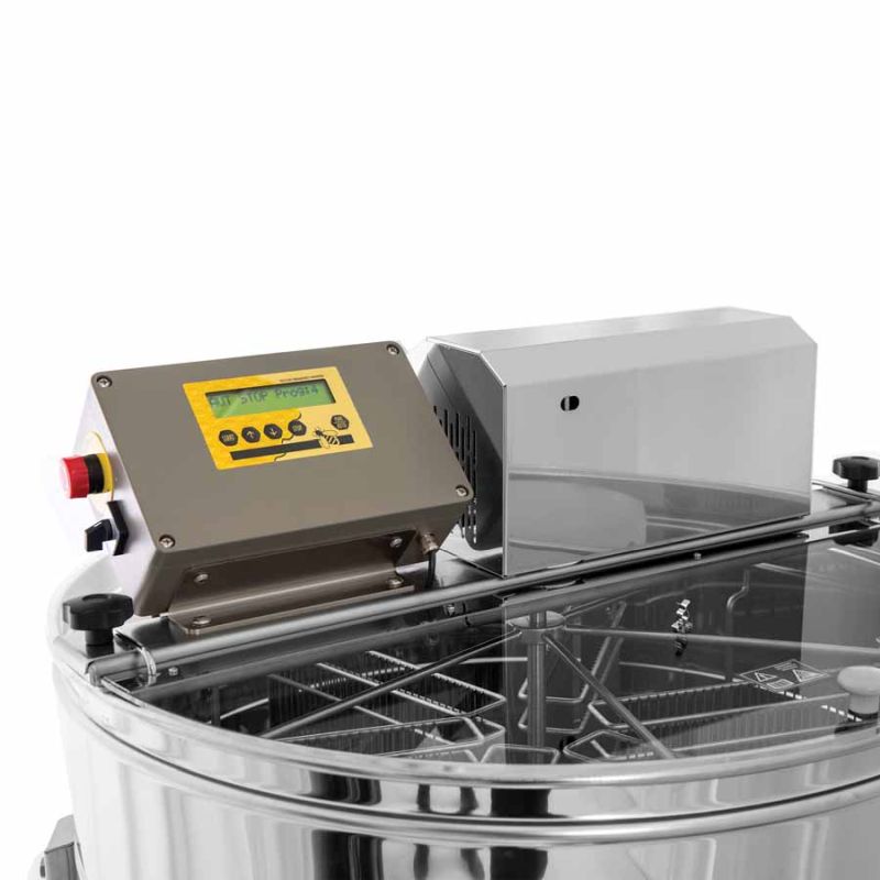 The Logar 12-frame self-reversing extractor is fully electric and features a fully automatic control plus a safety switch that immediately shuts off the motor when the lid is opened. The frame pockets are double-sided; a sheet metal panel between the pockets directs the honey flow. The drum bottom is modernly shaped, seamlessly welded and sloped towards the outlet. The stainless steel pinch valve is welded at the deepest possible point so that all honey can be drained. All honey-contacting parts are made from food-grade materials. The lid is made of transparent acrylic glass. A special design of the feet ensures high stability.
